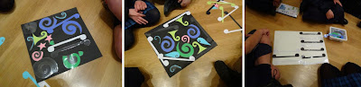 They shared and reflected on their work. How can you tell who made this? What could it tell us about the person? Does this pattern/shape seem to match the person who made it? How? How do the colours tell us about the person who made it? Which patterns are similar? How? How could you describe the patterns?