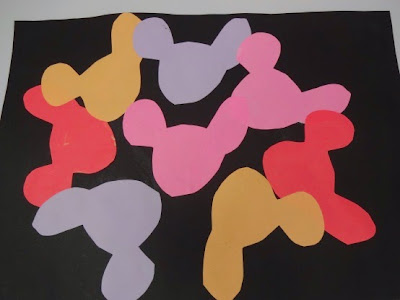 The art making session in the studio allowed everyone to feel proud of their work. Each student chose a symbol that said something about them (e.g. plane, computer, cat) and made a stencil which they drew around to make 8-12 identical shapes in a colour(s) of their choice. They experimented with pattern by moving the shapes around their chosen background paper. The use of more technical terms such as overlapping, reflecting and rotating then modelling what I meant was good for some of the students when making their patterns. They chose their favourite pattern and glued it in place.